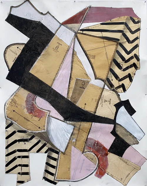 Mixed media collage with dress making patterns, acrylic paint, oil stick and charcoal on stretched canvas.