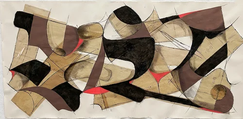 Tissue, charcoal, acrylic paint, and beeswax collage on paper.