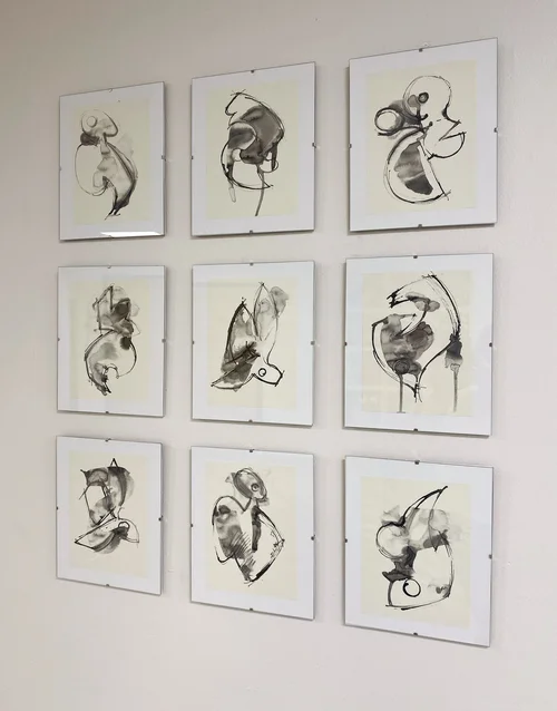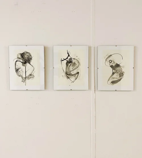 Charcoal drawings on a collage of acrylic paint on paper, toned grey paper, and brown craft paper.