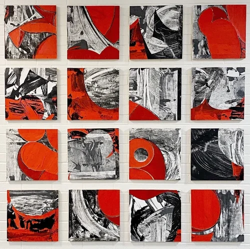 Billboard mixed media collage, acrylic paint, painted papers, charcoal on stretched canvas