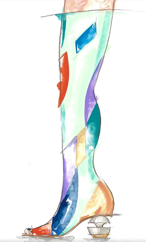 A capsule collection of footwear and handbags comprising of three detail trend groups. Initiated consumer attitude, mood, concepts, materials and color direction, designs, sketches, final specs, all proto corrections and updates undertaken to final market samples. Produced hand rendered large scale illustrations of 6 of the final pieces, each work measuring approx. 60” x 42” / charcoal, soft pastels, acrylic paint.